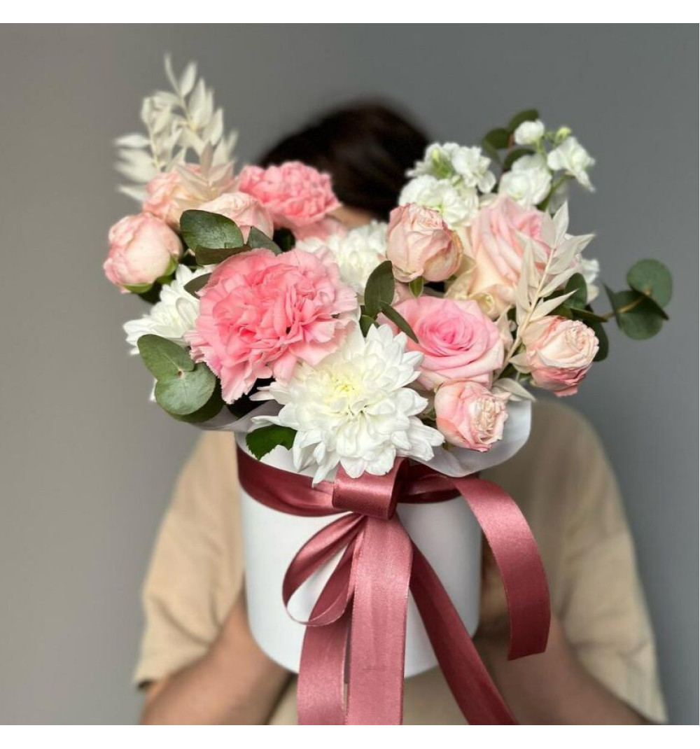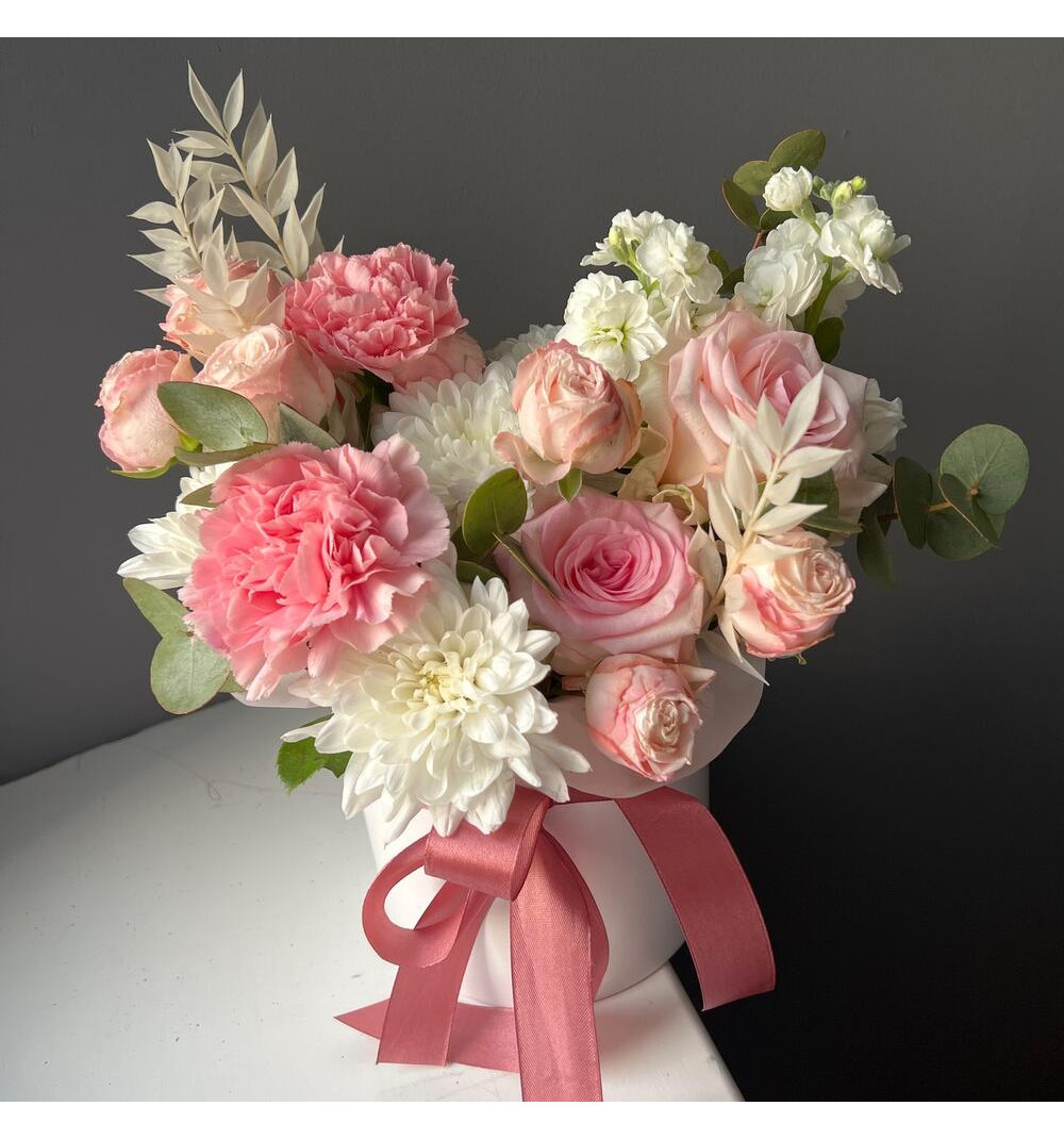 Купить Кустовые пионовидные розы, маттиола и хризантема в шляпной коробочке в Абае за 15 000 ₸ | интернет-магазин «Guls»